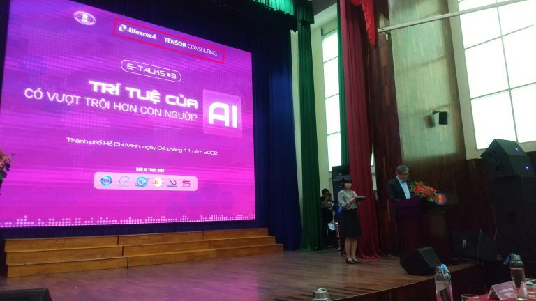 • アレクシード・ベトナムの社長も挨拶をさせて頂きました。壇上のモニターにも、当社のロゴとテンソル・コンサルティング様の社名を記載して頂いていました。