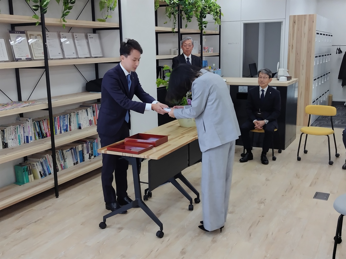 写真は、日本語の名刺や社章などの支給品を授与しているところです。