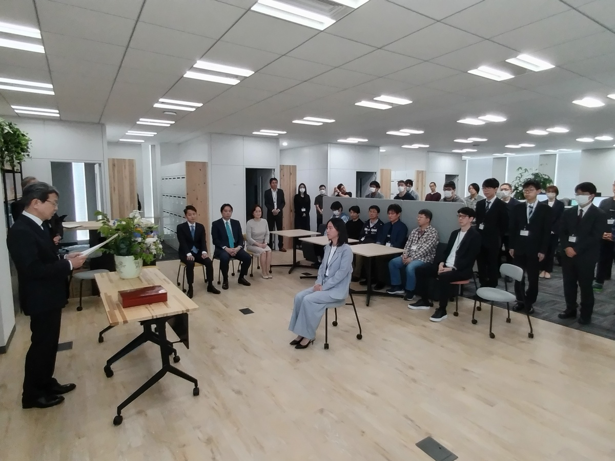 着任式には、出社している社員の皆さんにも参列して頂きました。 在宅勤務の皆さん、アレクシード・ベトナムの皆さんにはリモート会議システムで中継し、日本への着任を祝福して頂きました。