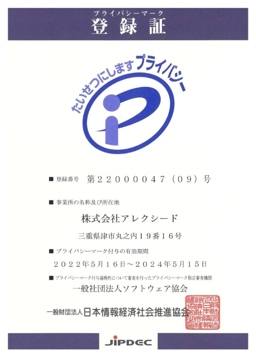 個人情報について適切な保護措置を継続する為に、二年に一度のプライバシーマーク認定の更新審査を受け、無事に認定を継続しました。